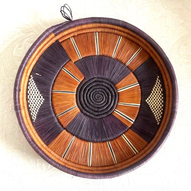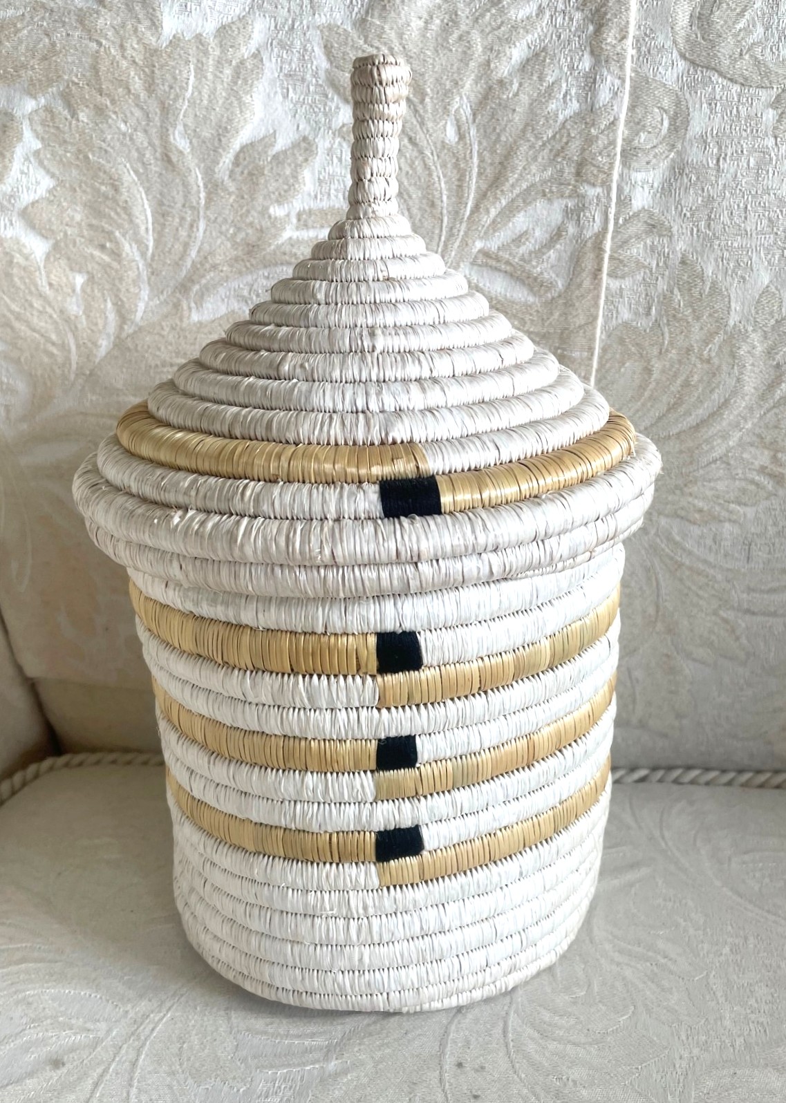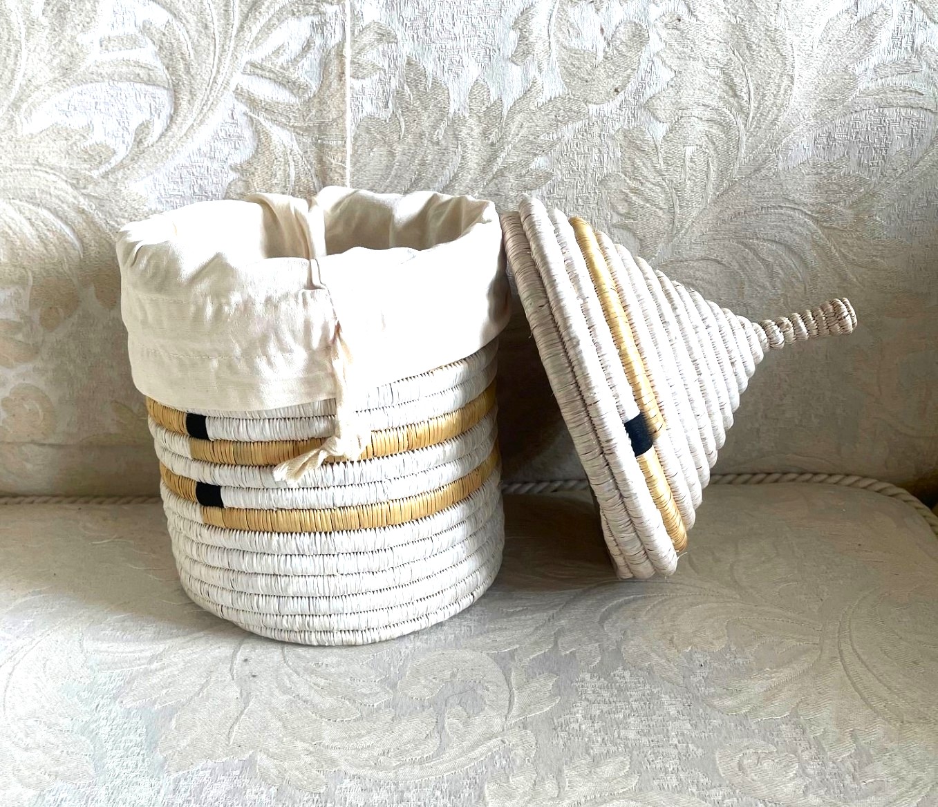 Panier avec couvercle, fabriqué dans le cadre du projet Womencraft en Tanzanie, en raphia, en blanc, beige et un peu de noir. Livré avec un sac intérieur, donc adapté pour garder les pommes de terre chaudes lors d’un raclette. Diamètre 16 cm, hauteur du panier 17 cm, avec couvercle 32 cm
