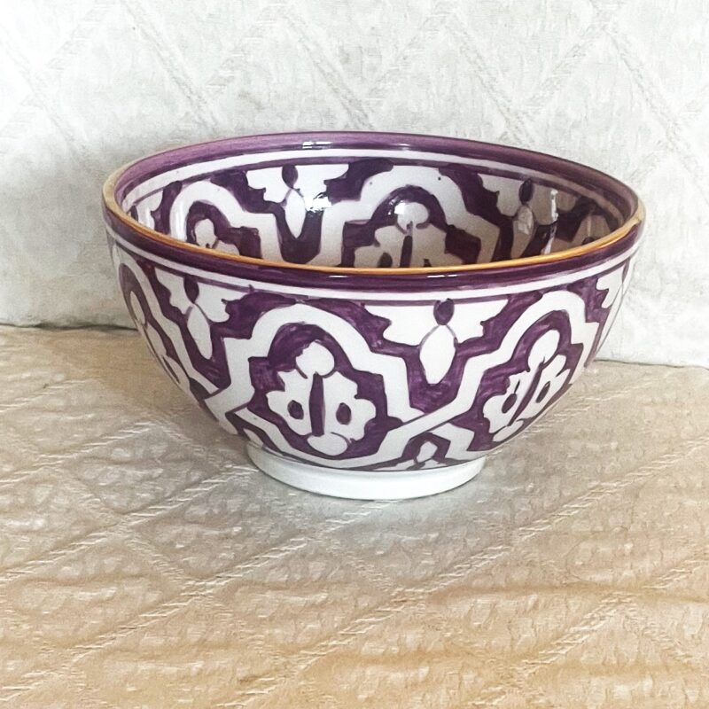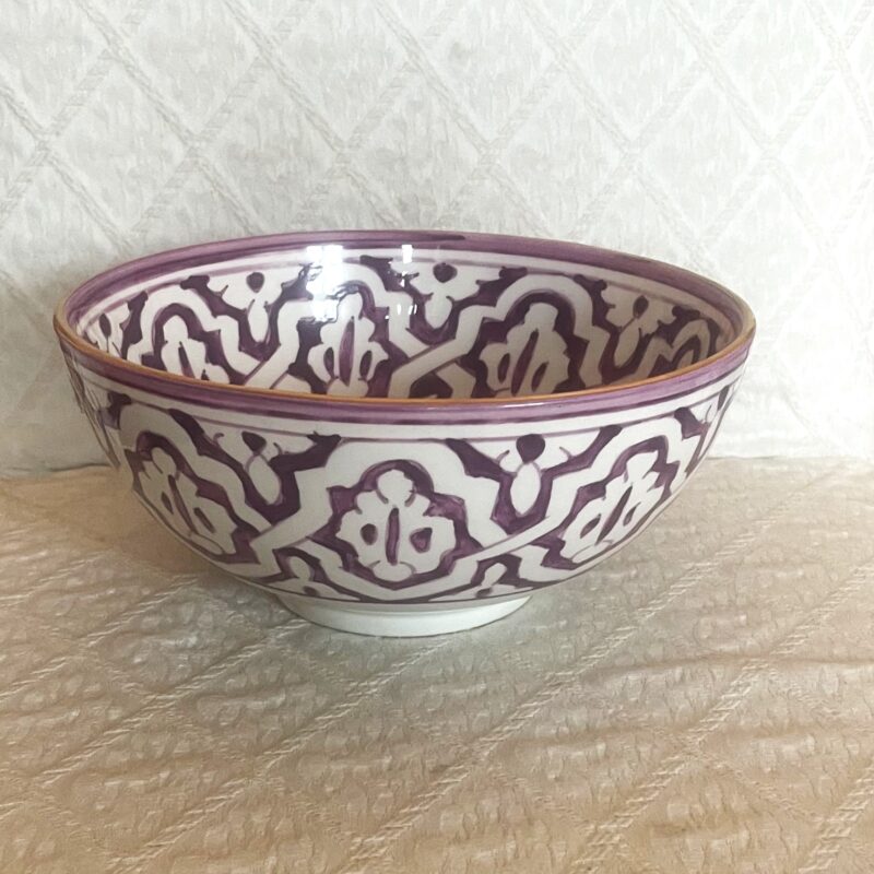 Bol traditionnel de Chabi Chic, fait à la main et peint à la main en purpur. Motif marocain classique, peint à l’extérieur et à l’intérieur, bord doré sur le dessus, rond, diamètre 20 cm, hauteur 10 cm, poids env. 750 gr. Convient pour les lave-vaisselle et les micro-ondes.