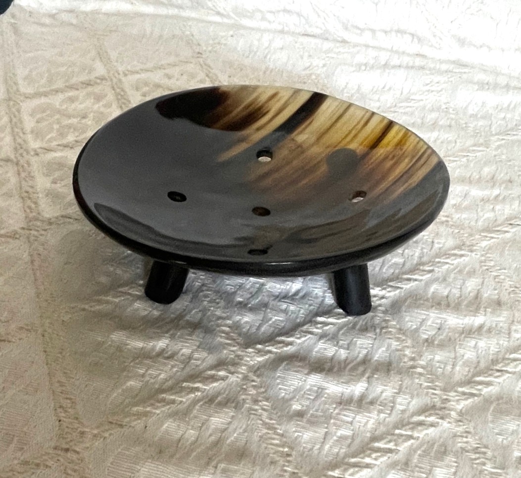 Le zébu est à Madagascar un grand soutien pour les agriculteurs : fort, endurant et résistant à la chaleur. Lorsque la durée de vie de l’animal est terminée, tout est utilisé : la viande, les os et la corne, y compris pour ces coupelles à savon. Elles sont majoritairement foncées, mais également parfois partiellement transparentes avec des rayures. Cette coupelle a un diamètre de 11 cm, avec 5 trous et repose sur 2 cm de petits pieds.