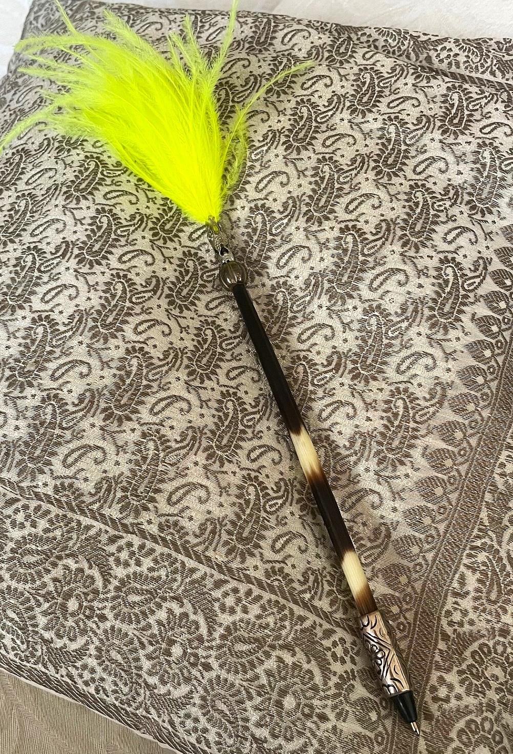 Stylos imaginatifs : corps en poils de porc-épic, environ 20 cm de long, plumes d’autruche (environ 8 cm) et ornements métalliques décoratifs. Fait à la main à partir de poils de porc-épic perdus – aucun porc-épic n’est plumés pour ces poils.