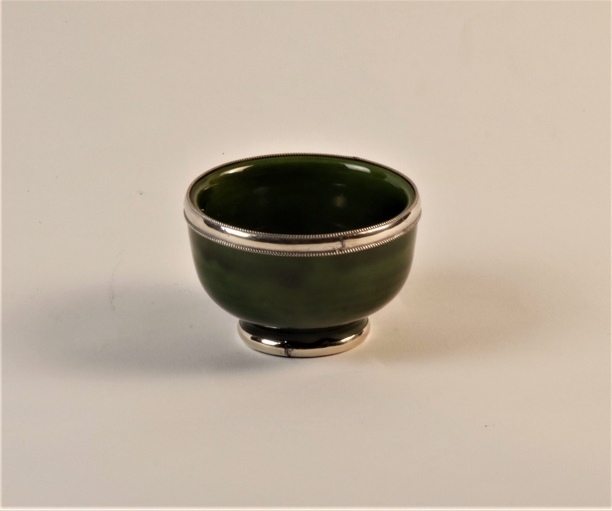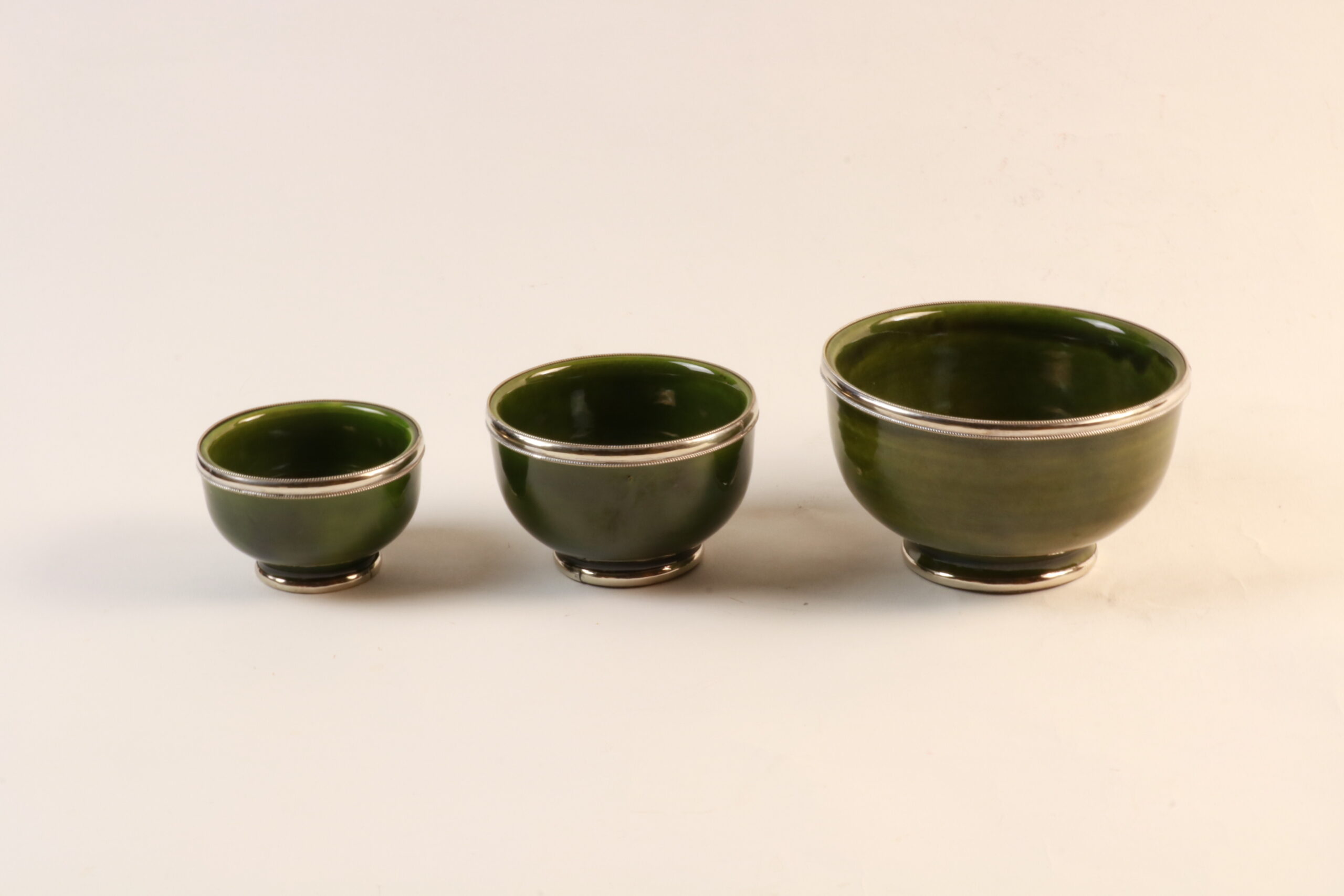 Klassische kleine Keramikschüssel, handgemacht, glasiert mit versilbertem Metallband, in Safi in der Region Marrakech gemacht, Durchmesser 8 cm, Gewicht ca. 100 g