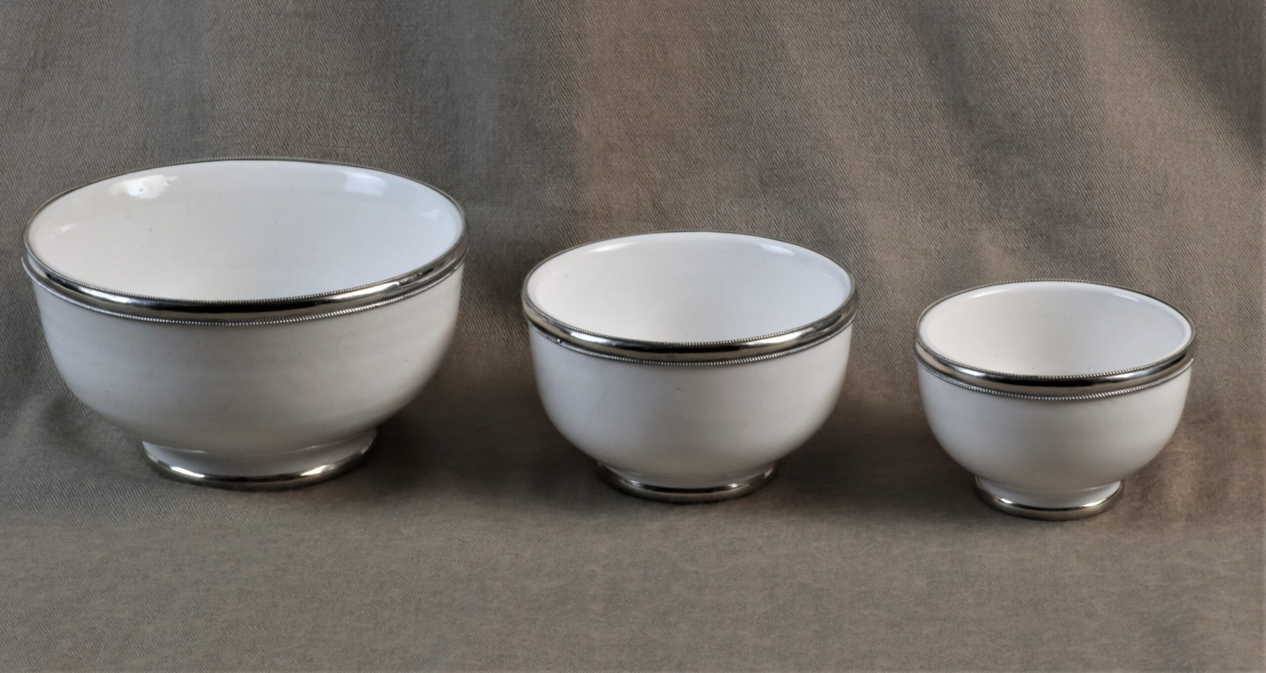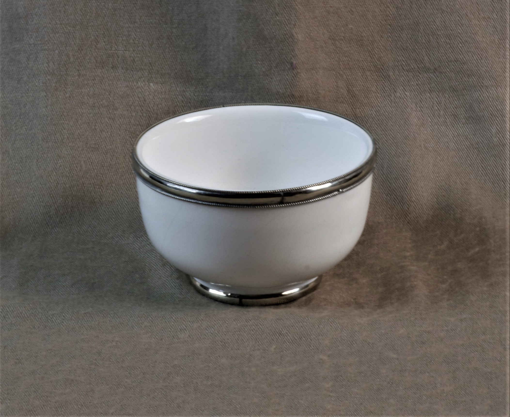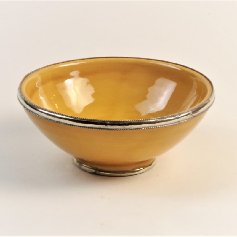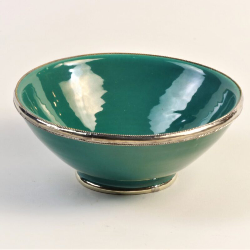 Klassische kleine Keramikschüssel, handgemacht, glasiert mit versilbertem Metallband, in Safi in der Region Marrakech gemacht, Durchmesser 10 cm, Gewicht ca. 160 g