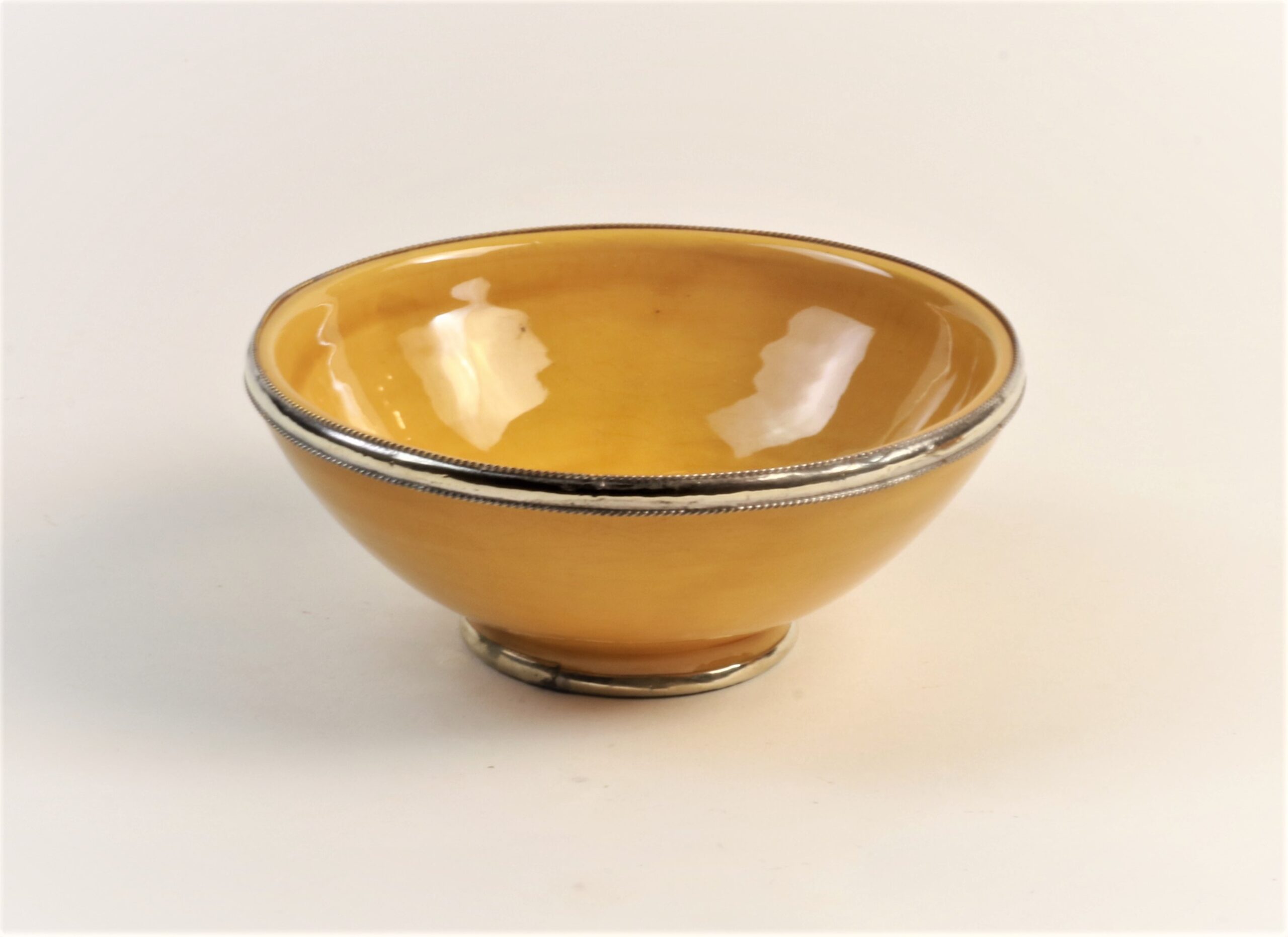 Klassische kleine Keramikschüssel, handgemacht, glasiert mit versilbertem Metallband, in Safi in der Region Marrakech gemacht, Durchmesser 8 cm, Gewicht ca. 100 g.