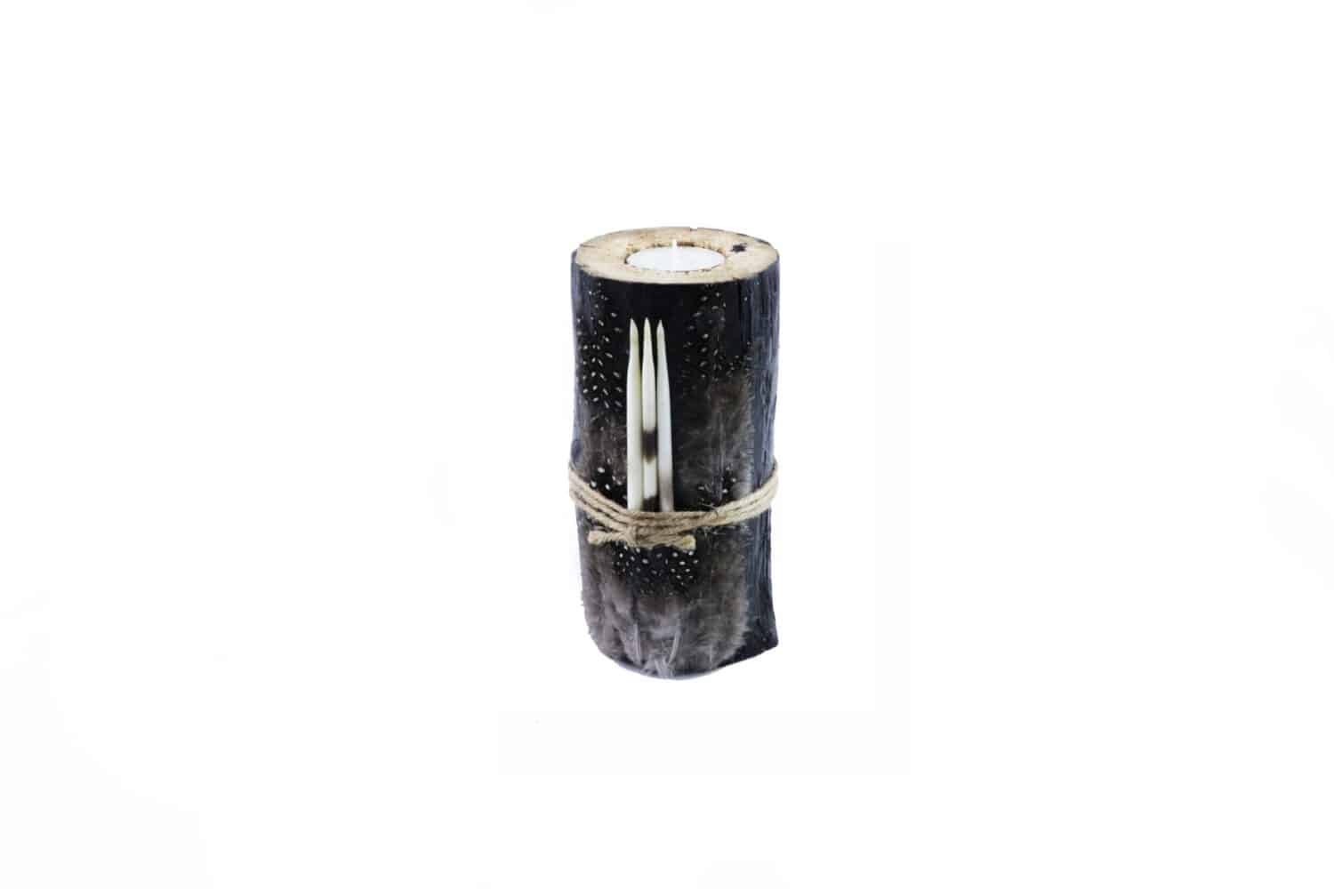 Handarbeit, Naturprodukte: Holz, Stachelschweinborsten, Perlhuhnfedern. Verpackung in durchsichtigem Cellophan. Grösse M: 17 cm hoch hoch. Breite unterschiedlich, meist 7-9 cm. Gewicht: 360 gr., Produzent: Kokskraal Handcrafts.
